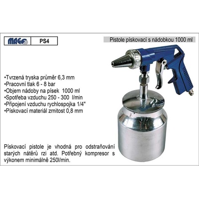 Technická data: Pracovní tlak 4 - 8 bar Spotřeba vzduchu 250 - 300 l/min. Doporučená zrnitost abraziva: 0,8 mm