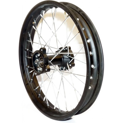 originální pitbike Tomanon; ocelové přední kolo, uchycení brzdového kotouče rozteč 100mm – středová díra 76mm, přední kolo rozměr 19×1.6, osa 15mm, střed s ložisky bez gufer...
