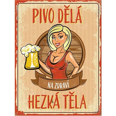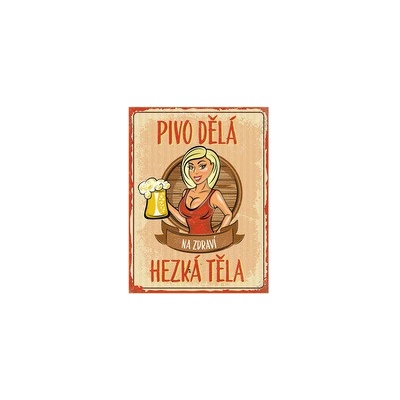\nRetro plechová cedulka s textem \"Pivo dělá hezká těla. Na zdraví.\".\nRozměr: 30 x 40 x 0,3 cm\nMateriál: smaltovaný plech\n
