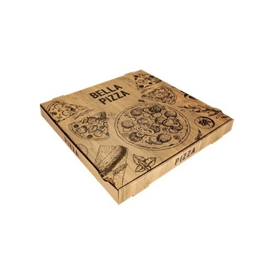 Krabice na pizzu s potiskem v povrchové úpravě hnědá.