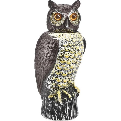 Maketa sovy s lesklýma očima k plašení ptactva na ovocních stromech, sadech a viních. Pohyblivá hlava se ve větru otáčí a působí velmi živě. Pro lepší stabilitu vyplňte základu...