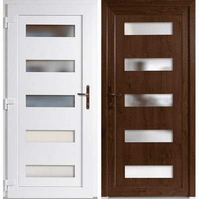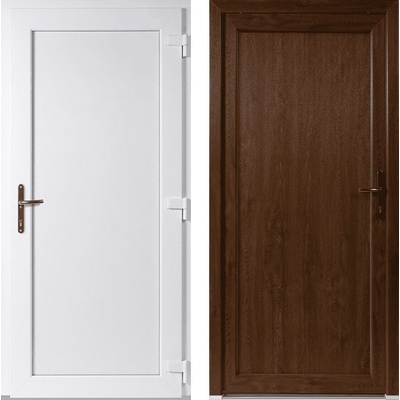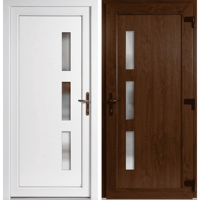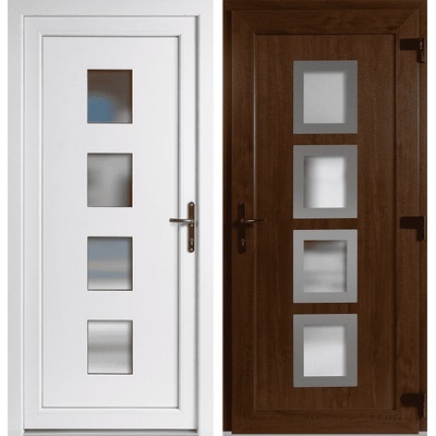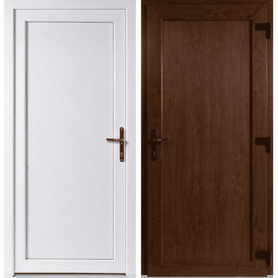 Skladem – vchodové jednokřídlé plastové dveře Emily Plné v barvě zlatý dub / bílá o rozměru 98 x 198 cm (rozměr i se zárubní) se otevírají dovnitř a jsou pravé. Jednoduchý...