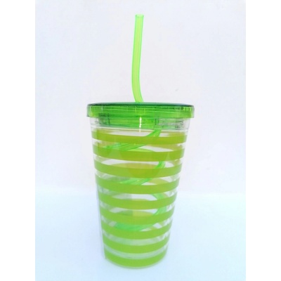 Plastový dvouplášťový kelímek se slámkou, 250 ml - zelený pruh
