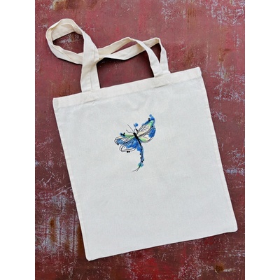 Praktická látková taška s výšivkou vážky. Velikost tašky je 35 x 40 cm. Taška má delší ucha - 60 cm na přehození přes rameno.