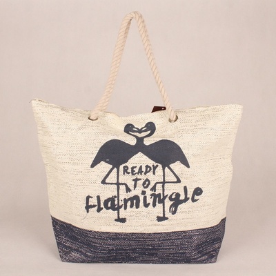 Moderní pohodlná béžovo-modrá plážová taška na rameno s vyobrazením modrých plameňáků a nápisem "Ready to flamingle" na přední straně tašky. Do látky jsou všity stříbrné...