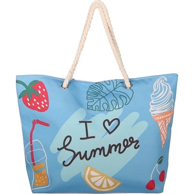 Velká plážová taška na rameno Bellugio v modré barvě - na přední straně tašky jsou vyobrazeny letní motivy a nápis "I Love Summer" - ucha přes rameno jsou v námořnickém...