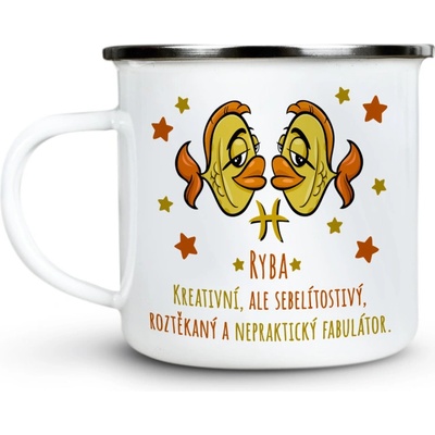 Plecháček s potiskem Zvěrokruh kočky Ryby Nostalgický smaltovaný hrnek s černým okrajem z nerezové oceli a potiskem ve dvou oblíbených velikostech je ideální pro Váš čajík, kafíčko, kakao, ale třeba i na pořádný grog. Plecháček je skvělý parťák na toulky přírodou, ale...