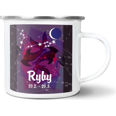 Bílý plechový hrnek se znamením Ryby. Plecháček disponuje objemem 300 ml, výškou 80 mm a průměrem 87 mm. Doporučujeme mýt v ruce.