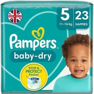 Pampers Baby Dry plenky 11-16kg (23ks) \nJednorázové plenky určené pro děti s hmotností 11–16 kg (velikost 5). Tento balíček je kompaktní variantou ideální pro cestování nebo...