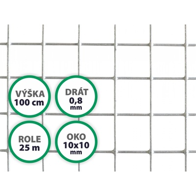 - standardní výška 100 cm - průměr drátu 0,80 mm - oko je čtvercové, velikost oka od 10x10 mm - povrchová úprava : pozinkování (Zn) - balení po 25 m