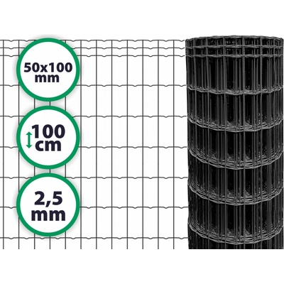 Velikost oka: 100x50mm. Tloušťka drátu: 2,5mm. Délka role: 25m. Výška: 1200mm. Barva: RAL7016 antracit.