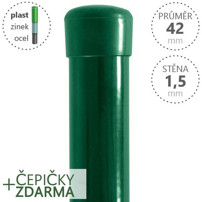 Plotový sloupek Damiplast, barva RAL 6005 (zelená), povrchová úprava Zn + PVC, průměr 42 mm, síla stěny 1,5 mm / s poplastem 2,0 mm, včetně čepičky. Výška dle...