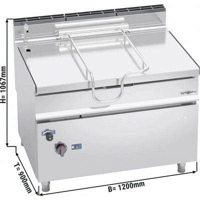 Pánev smažící sklopná plynová 120 l vyrobená z nerezové oceli – speciální teplovodná ocel RAEX. Masivní dno tl. 14 mm, nerezové odklopné víko. Automatické sklápění elektrické,...