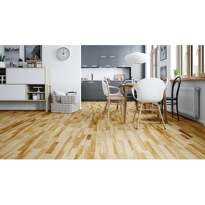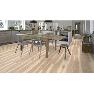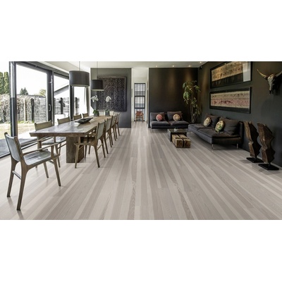 Třívrstvá dřevěná podlaha barvená do světlého odstínu s malým množstvím suků. Frézovaná hrana desky dodává podlaze lehkost a hloubku. Povrch podlahy je kartáčovaný a ošetřený...