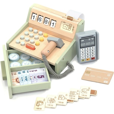 Dřevěná pokladna s terminálem, platební kartou a dřevěnými penězi! Díky této dřevěné pokladně může dítě naplno využít svou fantazii. S dřevěnými penězi, terminálem a tlačítky na...