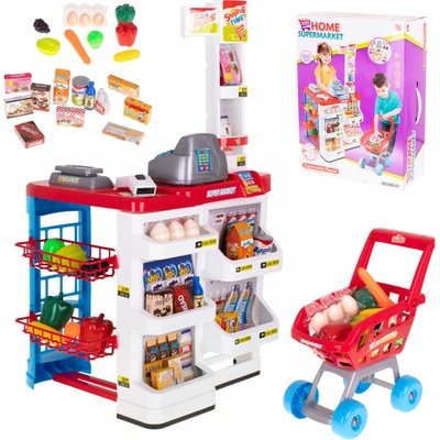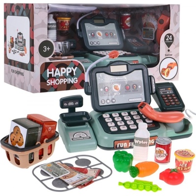 Pokladna. Velikost 22,5x15x22 cm. Obsahuje pokladnu, košík s potravinami, peníze a kreditní kartu. Pokladna funguje jako kalkulačka. Má vysunovací šuplík na peníze. Světlené a...