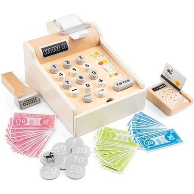 - dřevěná pokladna, ideální pro roli prodavače a zákazníka - obsahuje 17 dílů: kasa, mince, kalkulačka, účtenka - podporuje rozvoj sociálních dovedností, základů počtů a...