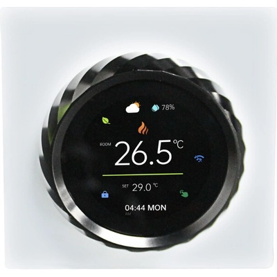 Týdenní prostorový termostat s možností časových programů. Ovládání pomocí dotykového displeje. Napájení bateriemi 2x AAA 1,5V.