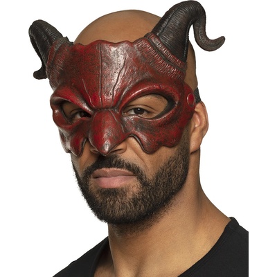 Červená polomaska čerta (démona) s černými rohy, gumová, dospělá velikost. Materiál: 90% polyurethane, 7% polyester, 3% železo