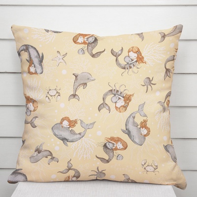 Bavlněný povlak na polštář s milým dětským motivem šedo-hnědých mořských panen s delfíny na žlutobéžovém podkladu. Je ušitý z hustě tkaného 100% bavlněného plátna s certifikátem...