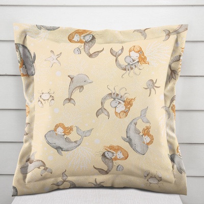 Bavlněný povlak na polštář s ozdobným lemem, s milým dětským motivem šedo-hnědých mořských panen s delfíny na žlutobéžovém podkladu. Je ušitý z hustě tkaného 100% bavlněného...