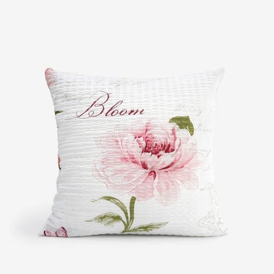 Krepový povlak na polštář s motivem růžových pivoněk, motýlů, ornamentů a psaných textů na bílém podkladu (z obou stran stejný motiv). Povlak je vyroben ze 100%...