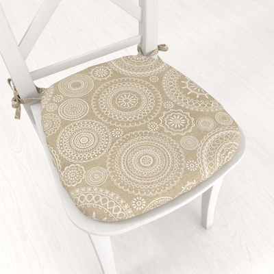 Oblý podsedák se vzorem bílých mandal na režném podkladu. Potah je ušitý z kvalitní a pevné španělské dekorační látky Leona z 55% bavlny a 45% polyesteru o gramáži 190 g/m2....