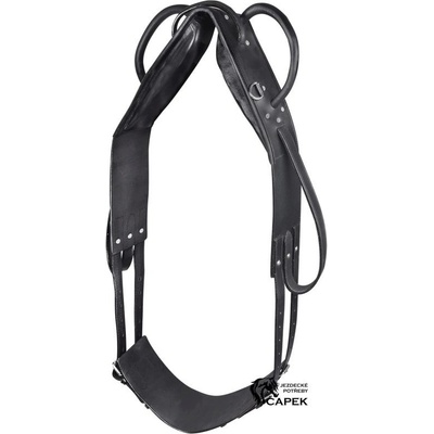 Lonžovací obřišník s madly a upínacími očky pro pomocné otěže. Madla jsou zpevněná, cc 8 cm vysoká. 6 kroučků pro pomocné otěže + 2 čtvercové pro možnost uchycení třmenových řemenů. Šířka: 7,5 cm (mini-shetland), 8,5 cm (shetland, pony), 11 cm (full) Mateiál kůže -...