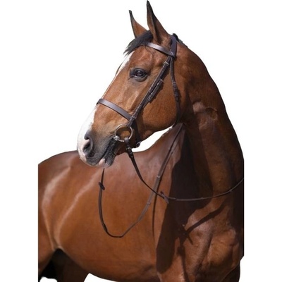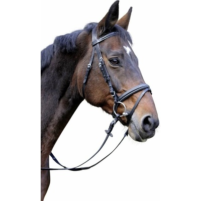 Kožená uzdečka s anglickým kombinovaným nánosníkem. Lehce vypolstrovaná čelenka a nánosník. Lineární podhrdelník a čelenka, poniklované železné spojení. Šířka otěží pro MSH a SH...
