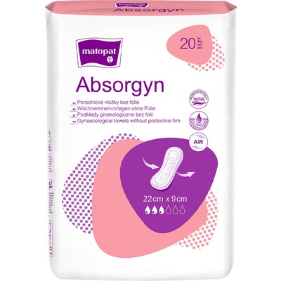 MATOPAT Absorgyn poporodní gynekologické vložky bez folie 22 cm x 9 cm, 20 ks Poporodní vložky bez fólie a se savým jádrem jsou vhodné pro hygienu v šestinedělí. Díky vysoce...