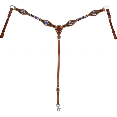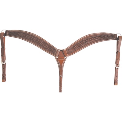 Vysoce kvalitní westernový poprsník vyrobený z kůže. Zdobený kontrastním prošíváním. Vybavený kováním ve stříbrné barvě. Ve velikosti QH.