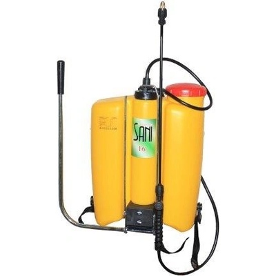 Zádový tlakový postřikovač ve tvaru zaobleného kvádru o objemu 16 l. Postřikovač je žlutý s černým nástavcem a s postřikovací pákou, stříbrnou hadičkou, modrýma nožičkama a se...