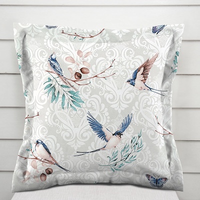 Bavlněný povlak na polštář s ozdobným lemem, se vzorem vlaštovek s motýlky na světle šedém ornamentu. Je ušitý z hustě tkaného 100% bavlněného plátna s certifikátem zdravotní...