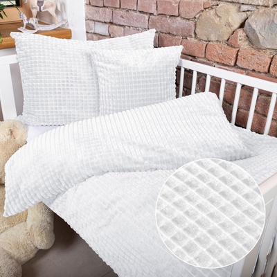 Dětské hřejivé povlečení do postýlky s 3D kostičkovým vzorem v bílé barvě. Je ušité z plyšově hebké a hřejivé polyesterové látky Minky s certifikátem zdravotní nezávadnosti...