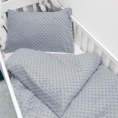 Dětské hřejivé povlečení do postýlky s 3D vytlačeným vzorem puntíků ve stříbrnošedé barvě. Je ušité z plyšově hebké a hřejivé polyesterové látky Minky s certifikátem zdravotní...