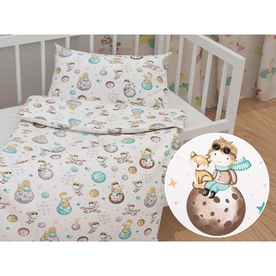 Dětské bavlněné povlečení do postýlky s milým dětským motivem Malého prince mezi planetami v modrozelených, hnědých a šedých barvách na bílém podkladu. Je ušité z hustě tkaného...