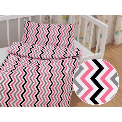 Dětské bavlněné povlečení do postýlky se vzorem růžovo-šedo-černých cik-cak proužků na bílém podkladu. Je ušité z hustě tkaného 100% bavlněného plátna s certifikátem zdravotní...