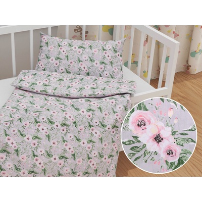Dětské bavlněné povlečení do postýlky se vzorem kvetoucích růží na šedém podkladu. Je ušité z hustě tkaného 100% bavlněného plátna s certifikátem zdravotní nezávadnosti Oeko-Tex...