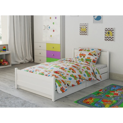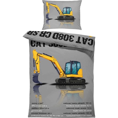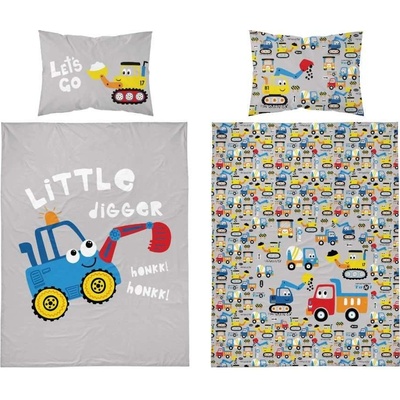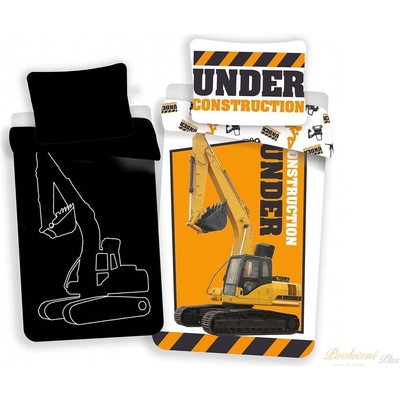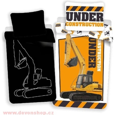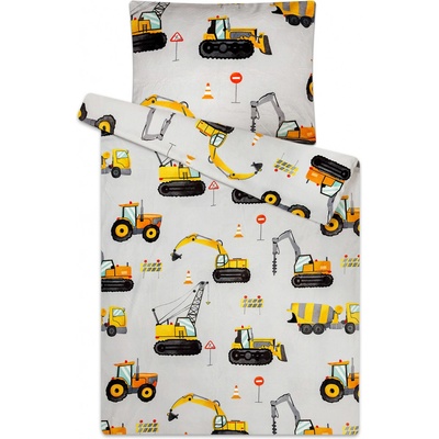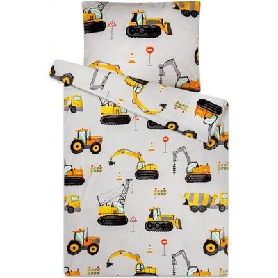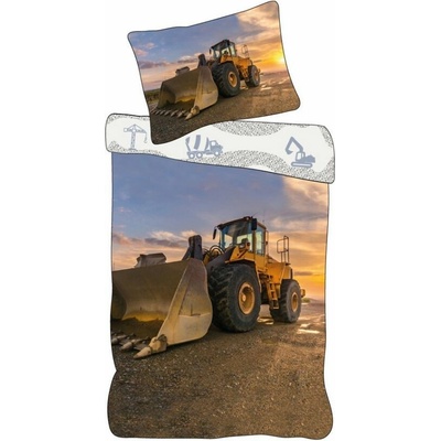 Bavlněné stavební ložní povlečení s bagrem / nakladačem. Na přední straně povlečení je velký žlutý nakladač / bagr. Povlečení je oboustranné - z druhé strany, která je bílé barvy, jsou různé malé stavební stroje.