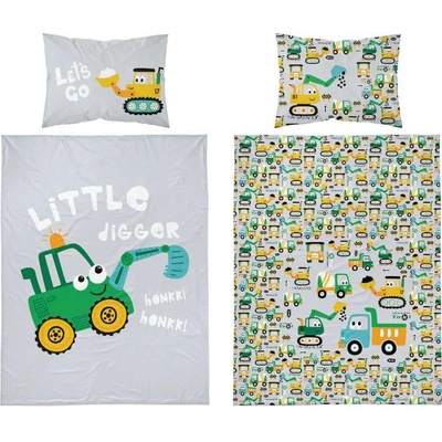 DETEXPOL Povlečení do postýlky Bagr zelený 100/135, 40/60 Dětské bavlněné povlečení do postýlky, motiv peřiny je z každé strany jiný, zapínání na zip, praní na 40°C Materiál: 100% Bavlna Rozměr: 1x 100/135, 1x 40/60 cm