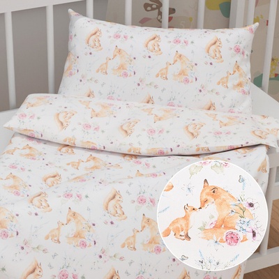 Dětské bavlněné povlečení do postýlky se vzorem lišek a soviček na bílém podkladu. Je ušité z hustě tkaného 100% bavlněného plátna s certifikátem zdravotní nezávadnosti Oeko-Tex...