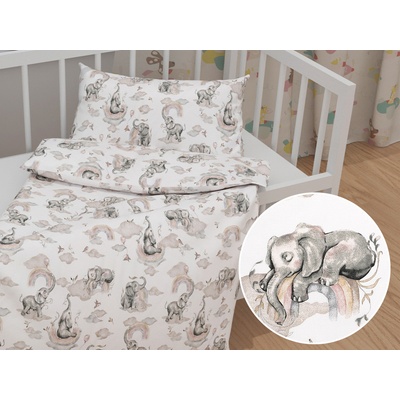 Dětské bavlněné povlečení do postýlky se vzorem slonů s šedohnědou duhou na bílém podkladu. Je ušité z hustě tkaného 100% bavlněného plátna s certifikátem zdravotní nezávadnosti...