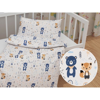 Dětské bavlněné povlečení do postýlky s milým dětským motivem modro-béžových lesních zvířátek na bílém podkladu. Je ušité z hustě tkaného 100% bavlněného plátna s certifikátem...