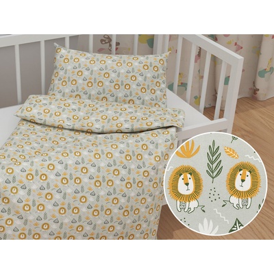 Dětské bavlněné povlečení do postýlky s milým dětským motivem lvů mezi listy, v oranžových, zelených a bílých barvách na světle šedém podkladu. Je ušité z hustě tkaného 100%...