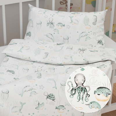 Dětské bavlněné povlečení do postýlky s milým dětským motivem zeleného mořského světa na bílém podkladu. Je ušité z hustě tkaného 100% bavlněného plátna s certifikátem zdravotní...