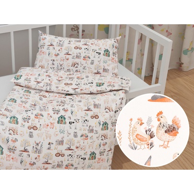Dětské bavlněné povlečení do postýlky s milým dětským motivem domácích zvířátek na farmě na bílém podkladu. Je ušité z hustě tkaného 100% bavlněného plátna s certifikátem...