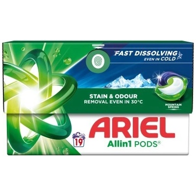 Ariel All in1 Mountain Spring gelové kapsle 19 ks Výjimečné čisticí účinky v jedné malé kapsli. Kapsle na praní prádla Ariel Allin1 Pods Mountain Spring mají unikátní...