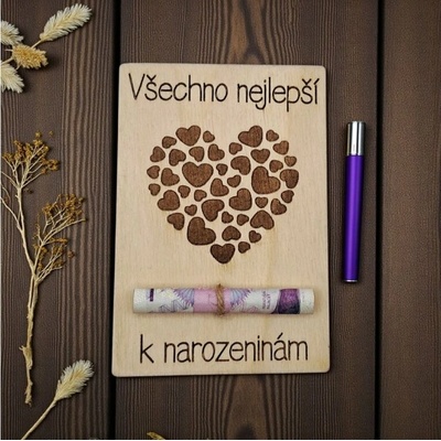 Hledáte originální způsob, jak darovat peníze k narozeninám? Naše dřevěné přání je elegantní a nápaditou alternativou k obyčejné obálce. Přání je vyrobeno z kvalitní dřevěné...