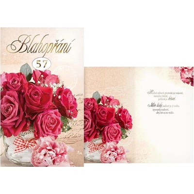 Přání k narozeninám Krásné přání k narozeninám udělá určitě větší radost než pouhá sms. Text na přední straně: Blahopřání 57 Text uvnitř přání: Hodně zdraví, protože je vzácné,...