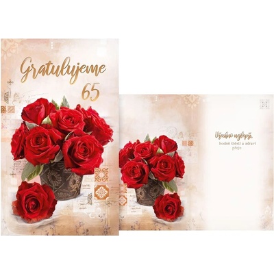 Text na přední straně: Gratulujeme 65 Text uvnitř přání: Všechno nejlepší, hodně štěstí a zdraví přeje Papír: pohlednicový karton Přání je baleno v sáčku, součástí balení...